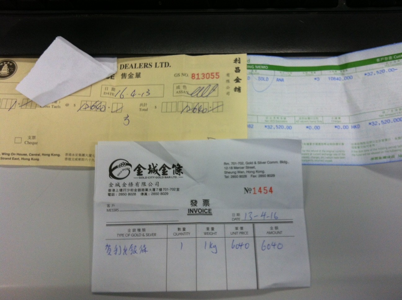 買了3個1安士金幣、1兩金粒、1000克銀條(但沒拍照)。